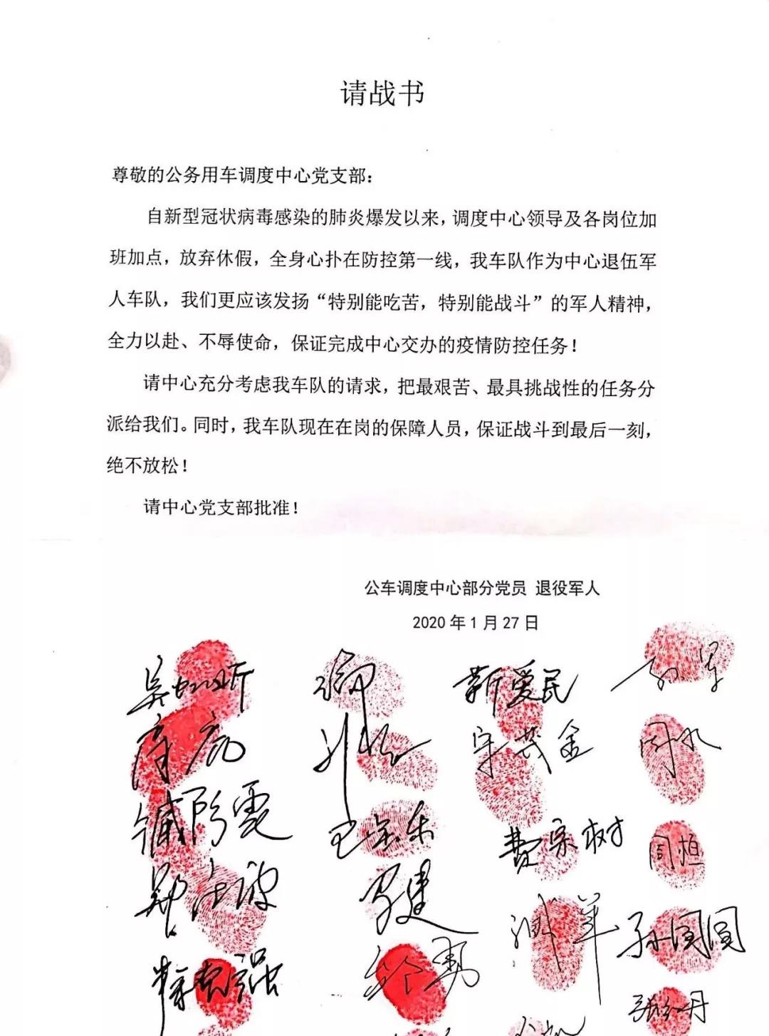 “請把最艱苦、最具挑戰(zhàn)性的任務(wù)分派給我們,我們必定全力以赴、不辱使命,保證完成組織交辦的各項疫情防控任務(wù)”。1月27日,公車調(diào)度中心23名黨員同志向黨支部遞交了一份印滿紅手印的“請戰(zhàn)書”,短短百余字,字字鏗鏘,句句深情。他們中有工作經(jīng)驗豐富的“60后”、有剛走上工作崗位的“95后”、有兩歲孩童的媽媽、有備受父母寵愛的女兒......但此刻,面對這場無聲的“戰(zhàn)役”,他們不忘自己更是一名黨員、是退役軍人、是勇往直前的“戰(zhàn)士”,他們迫切希望加入黨支部的疫情防控黨員先鋒隊,為打贏這場疫情防控阻擊戰(zhàn)貢獻自己的力量。