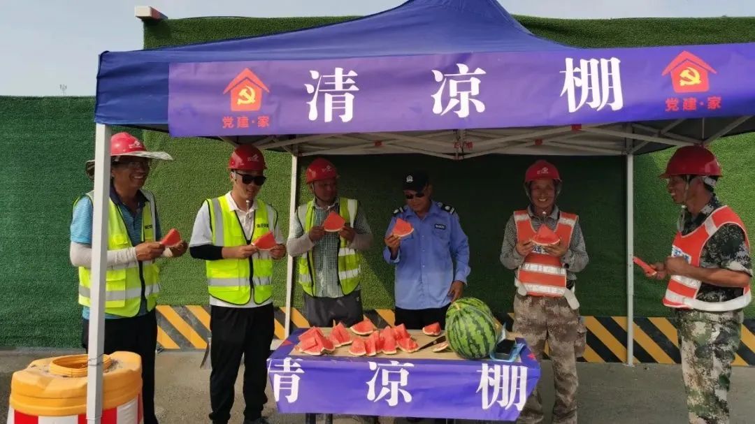 在公司迎賓大道二期快速化改造工程施工現(xiàn)場(chǎng),“黨建·家”清涼棚出現(xiàn)在工地的多個(gè)角落,棚內(nèi)常備西瓜、礦泉水、藿香正氣液等防暑降溫物品,來(lái)往的施工人員熱了渴了,來(lái)到棚內(nèi)喝上幾口茶,吃上幾口瓜,消了暑繼續(xù)為項(xiàng)目建設(shè)貢獻(xiàn)自己的力量。