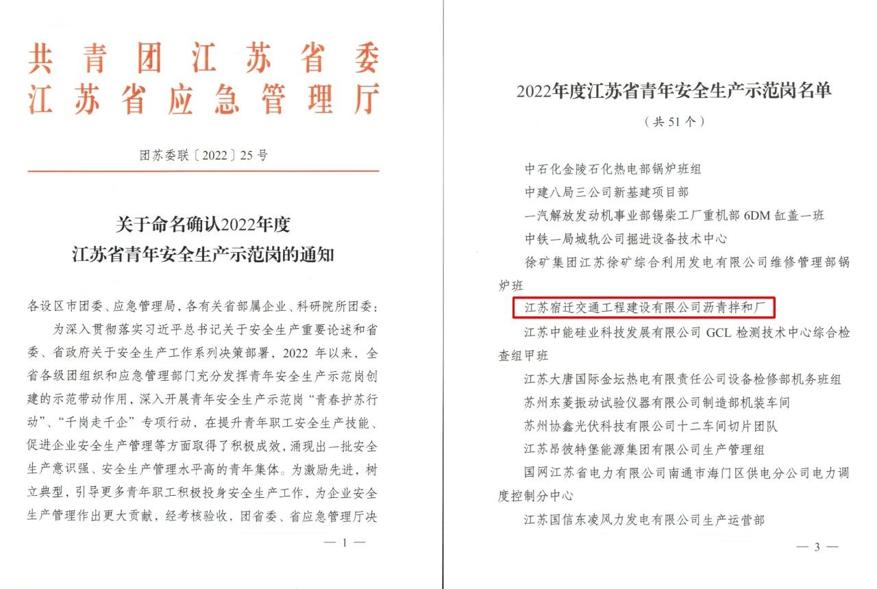 近日,共青團江蘇省委和江蘇省應(yīng)急管理廳聯(lián)合發(fā)文,公布“2022年度江蘇省青年安全生產(chǎn)示范崗”名單,宿遷交建瀝青拌和廠成功入選。