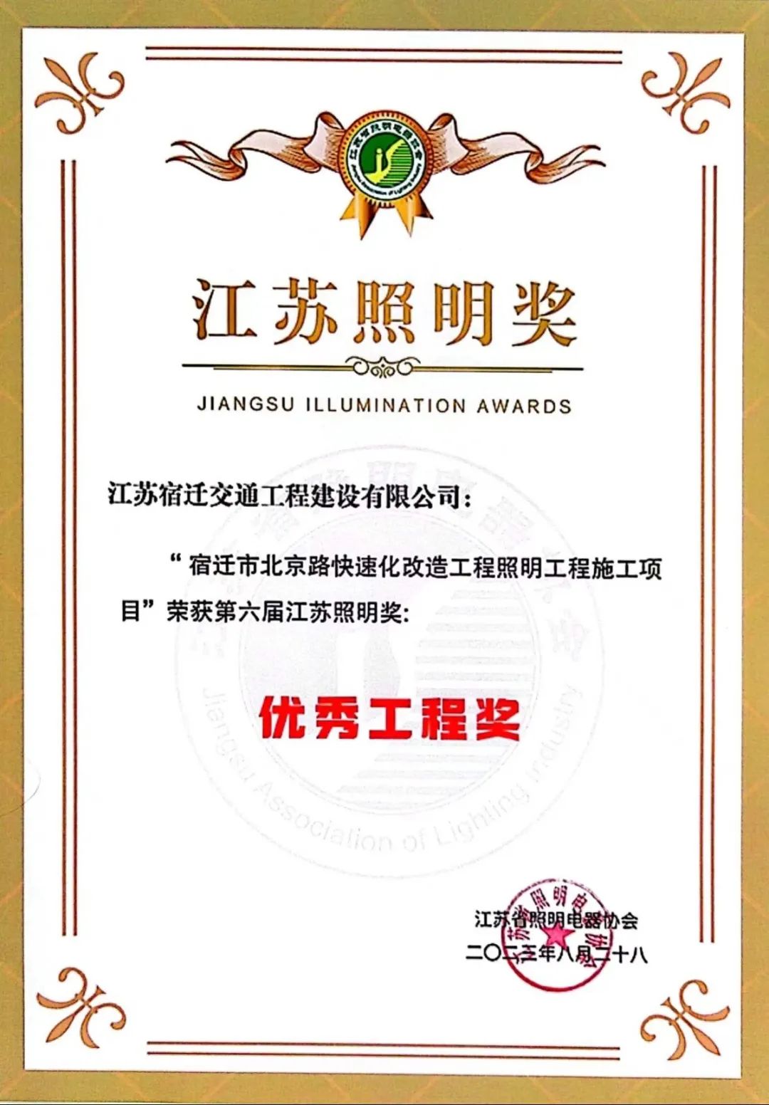 近日,由江蘇省照明協(xié)會主辦,照明獎組委會組織專家評審的第六屆江蘇照明獎進行了終審并公示評審結(jié)果。由宿遷交建承建的宿遷市北京路快速化改造工程照明工程施工項目榮獲優(yōu)質(zhì)工程獎。