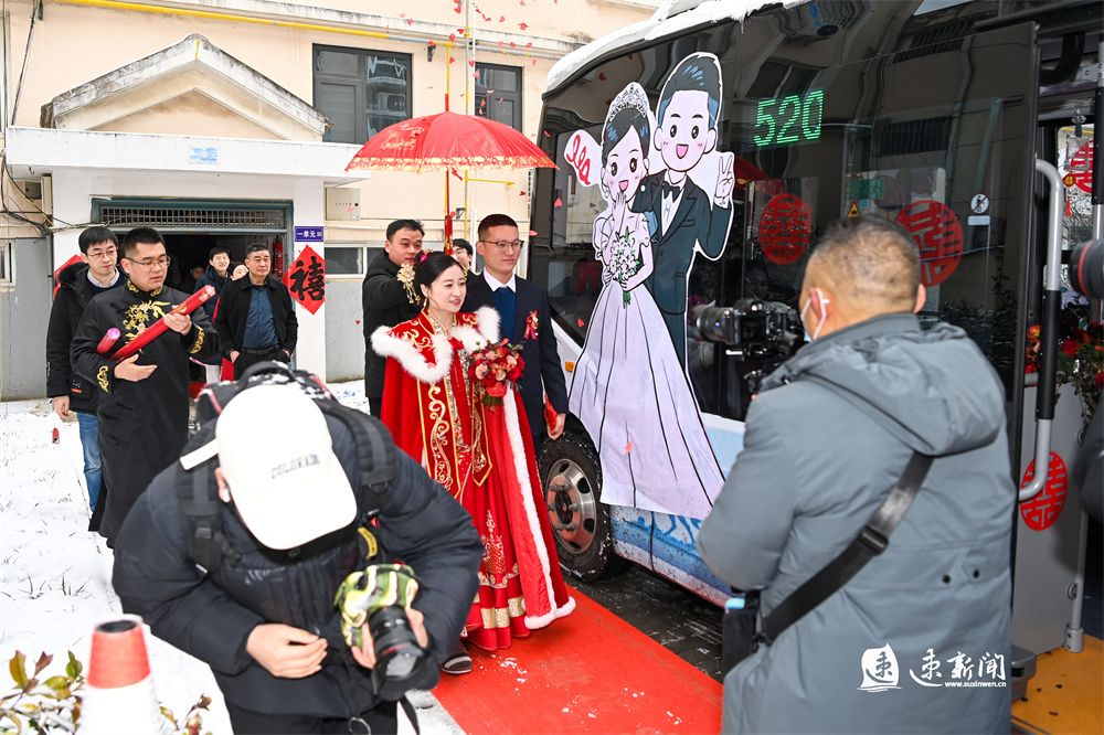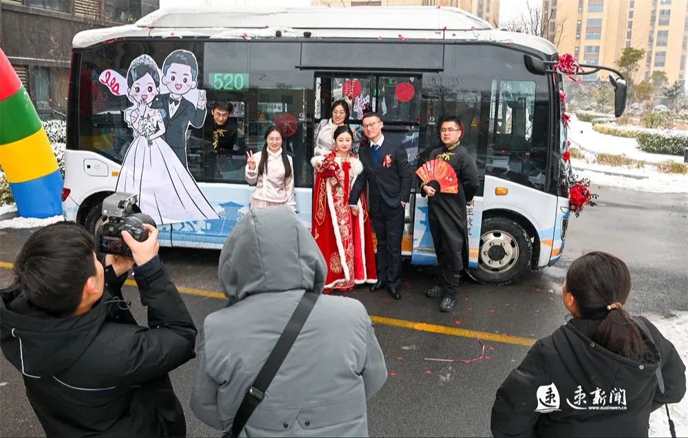 2月3日,在宿遷市區(qū)青華園小區(qū)附近,一輛精心裝飾鮮花、貼著大紅“囍”字的酒都小巴,惹人注目。在溫馨喜慶的車廂里,新郎、新娘跟大家合影、談笑,向著幸福美好的生活出發(fā)。