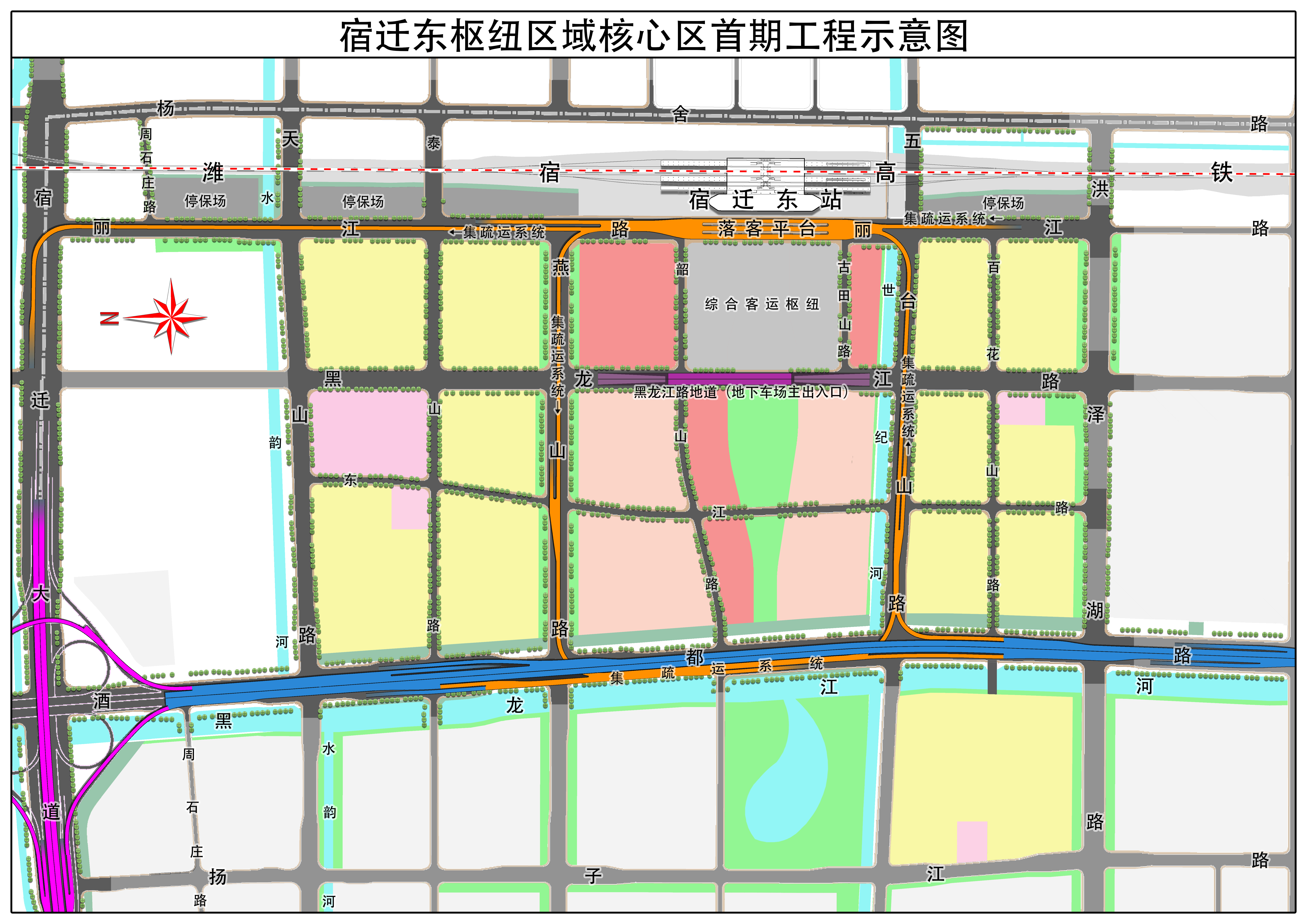 宿遷東樞紐區(qū)域核心區(qū)首期工程項目涵蓋五臺山路、麗江路、燕山路高鐵集輸運進出站高架工程、核心區(qū)過鐵通道、市政路網、停保場等工程。首期工程項目的實施,將有助于構建高鐵宿遷東站集疏運體系,完善核心區(qū)市政路網、管網、水利等設施,為核心區(qū)開發(fā)建設提供必要的基礎設施條件。