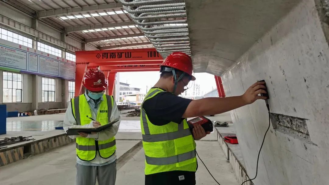 在通泰綠色建材生產基地箱梁預制加工區(qū)內,為了加強混凝土結構的質量驗收,工作人員正在對預制箱梁進行鋼筋保護層厚度檢測和記錄。