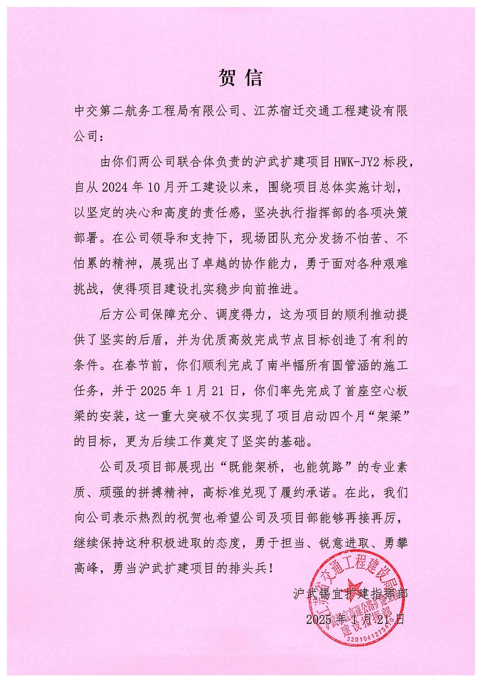 日前,由宿遷交建參建的滬武高速2標(biāo)項目,連續(xù)收到來自滬武錫宜擴建指揮部和江陰市交通運輸局的表揚賀信。信中高度肯定了宿遷交建在滬武高速公路2標(biāo)建設(shè)中的卓越表現(xiàn),充分認可了項目團隊的辛勤付出和公司綜合實力與專業(yè)水平。