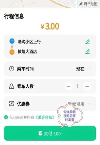 ④勾選我已閱讀并同意《乘客須知》、《購票須知》后完成支付,在上車點(diǎn)等候上車。