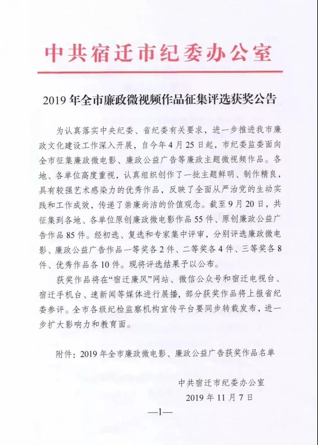 11月7日,宿遷紀(jì)委公布2019年全市廉政微視頻評選結(jié)果,集團(tuán)報送的參賽作品《路》、《責(zé)任》分別榮獲廉政公益廣告二等獎、廉政微電影優(yōu)秀作品的佳績。