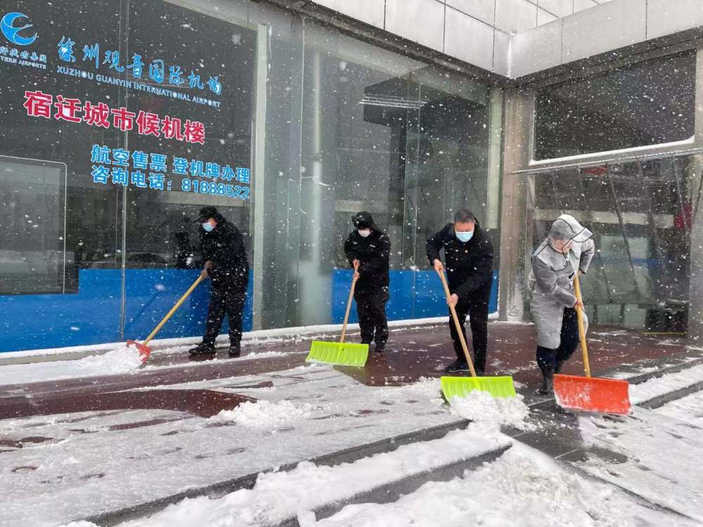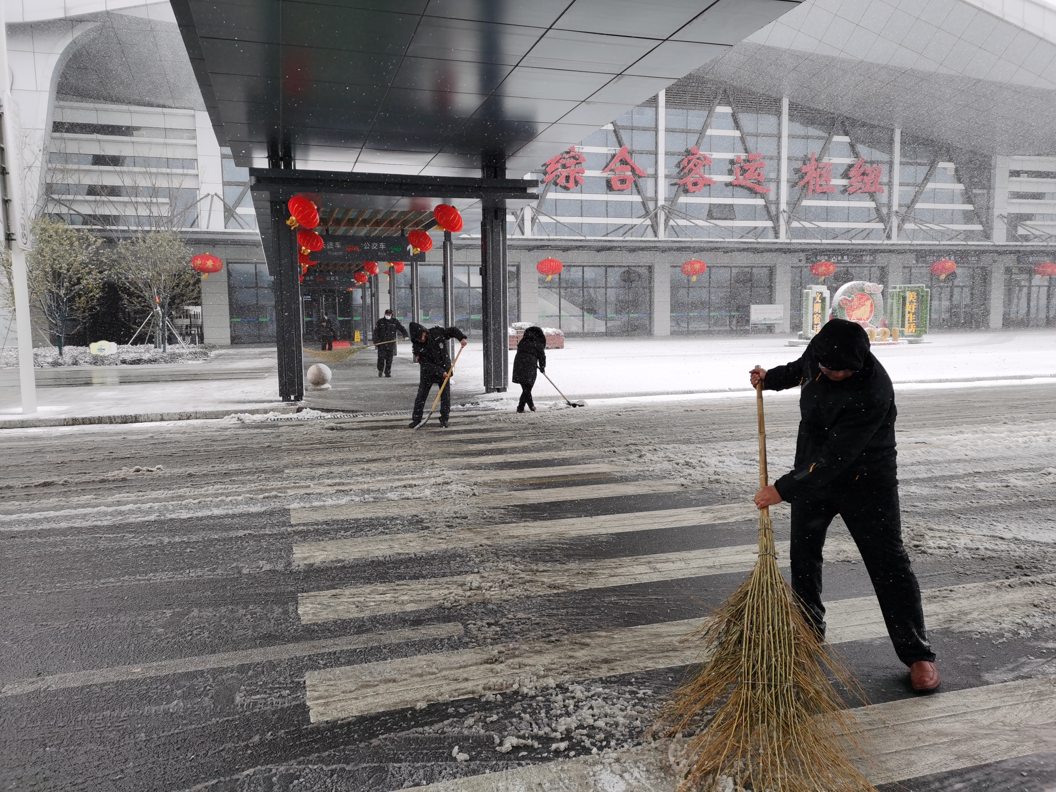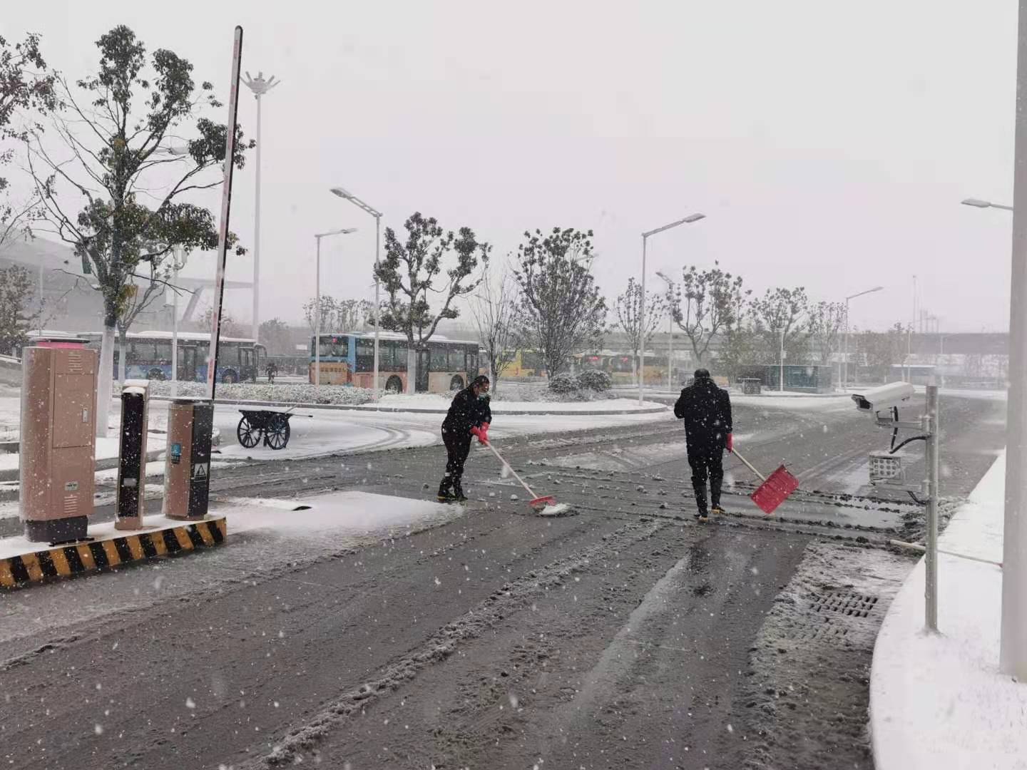 高鐵公司組織在崗職工和物業(yè)人員,利用推雪鏟、鐵鍬、掃帚等將高鐵宿遷站站前廣場積雪鏟開,對綜合客運樞紐外道路、公交停車場等易結(jié)冰的路面進行撒融雪處理,確保旅客出行安全。