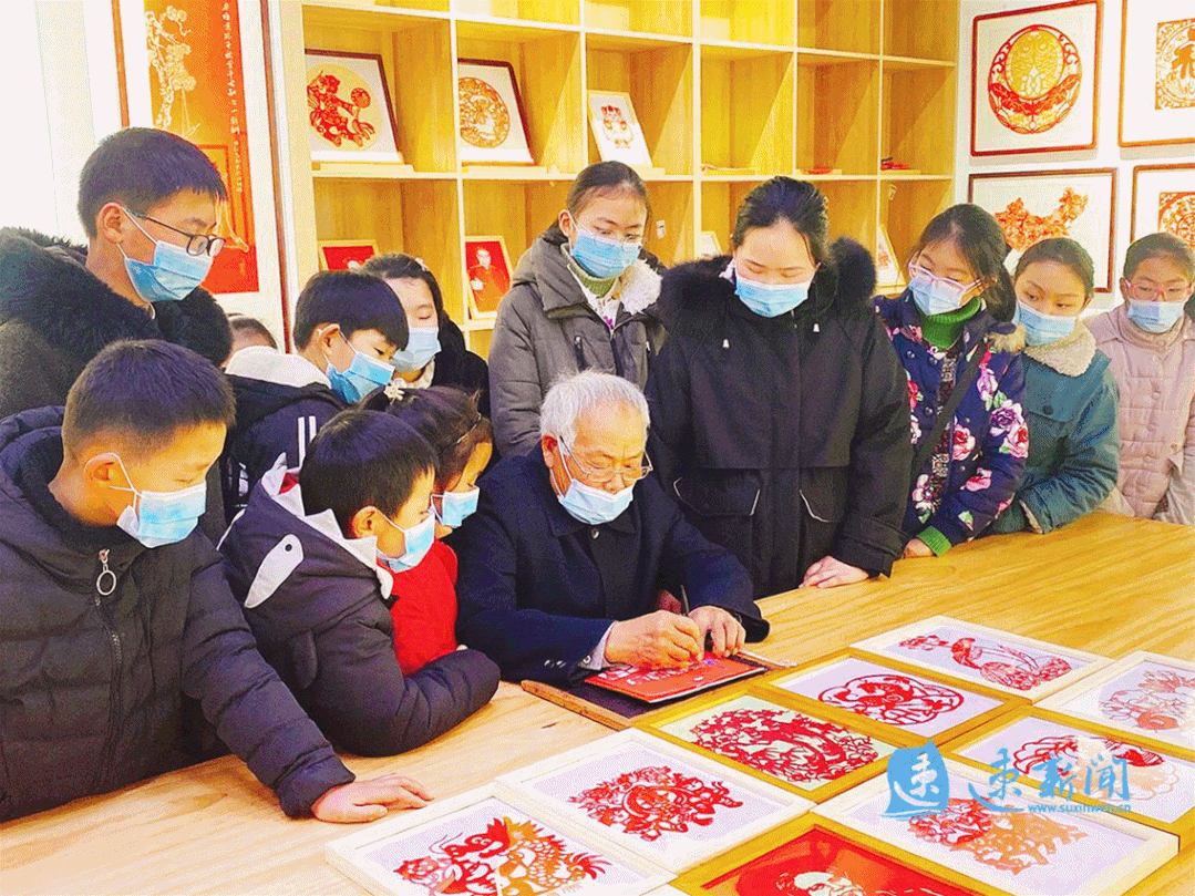 宿遷市非物質(zhì)文化遺產(chǎn)《刻紙門(mén)花》項(xiàng)目代表性傳承人蘇立功向孩子們講述“壓歲錢(qián)不變味”的意義和重要性,讓孩子從小樹(shù)立正確的文明新風(fēng)觀念;