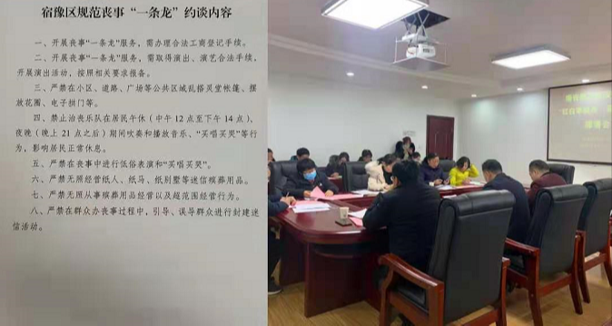 宿豫區(qū)召開(kāi)“喪事一條龍”培訓(xùn)約談會(huì),規(guī)定“喪事一條龍”服務(wù)內(nèi)容,簽訂承諾書(shū),制定懲處辦法。同時(shí),認(rèn)真落實(shí)“紅白事緩辦簡(jiǎn)辦”要求,向?qū)ο矄适轮髯龊眯麄鞴ぷ?,發(fā)出倡議書(shū)、簽訂承諾書(shū);