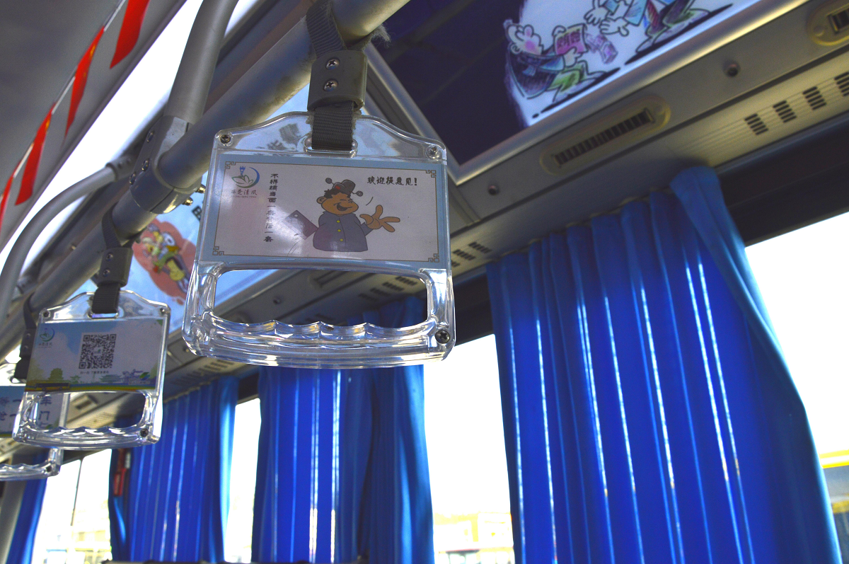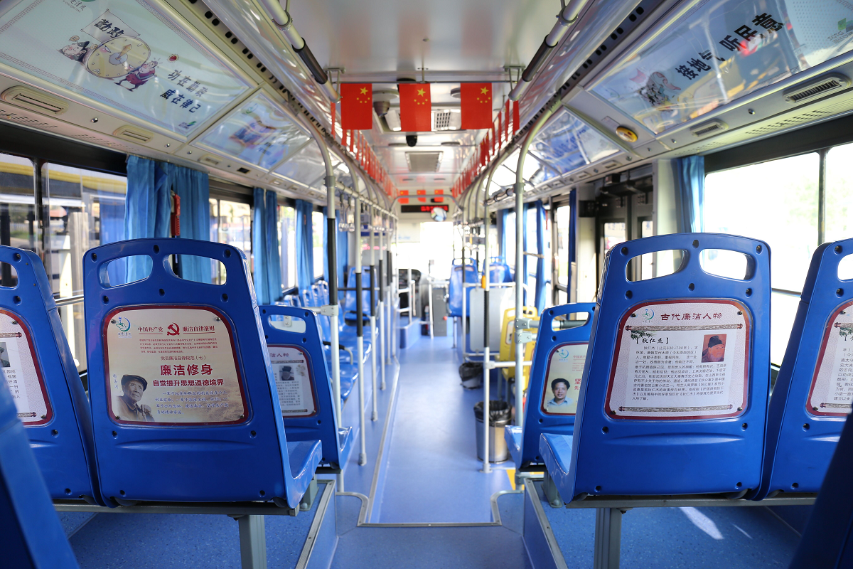 301路“西楚清風(fēng)號”公交車隊(duì)以“廉政文化”為車隊(duì)形象展示亮點(diǎn)。車廂內(nèi)部的宣傳燈箱和拉手吊環(huán)配以廉政漫畫和尚廉標(biāo)語,座椅背部放置古今廉政典范人物及事例的宣傳畫頁,車門頂部巧妙印有“開門納廉,關(guān)門拒腐”宣傳標(biāo)語。