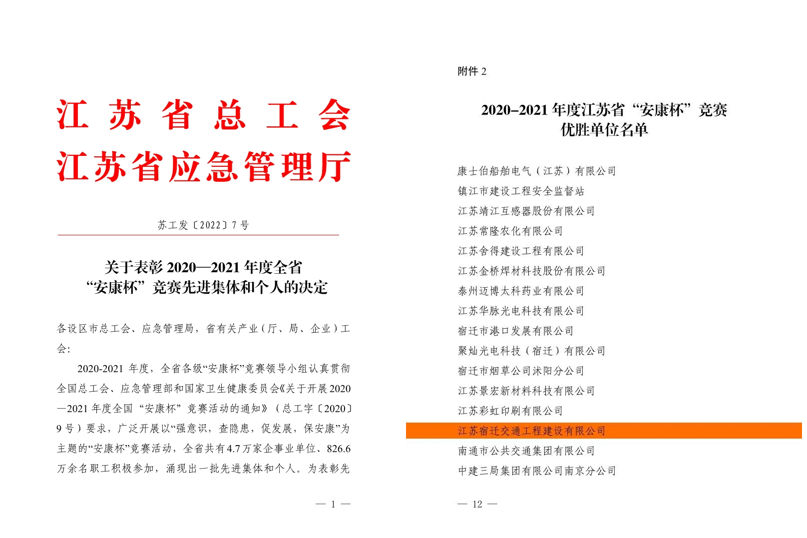 日前,省總工會(huì)和省應(yīng)急管理廳發(fā)文通報(bào)了2020-2021年度江蘇省“安康杯”競(jìng)賽評(píng)選情況,宿遷交建榮獲省“安康杯”競(jìng)賽“優(yōu)勝單位”稱號(hào)。
