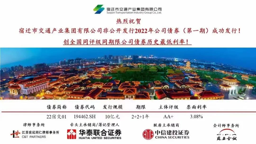 近日,集團(tuán)成功發(fā)行第一期非公開發(fā)行2022年公司債券,發(fā)行規(guī)模10億元,期限2+2+1年,由華泰聯(lián)合證券、中信建投證券聯(lián)合承銷,票面利率3.08%,創(chuàng)全國(guó)同評(píng)級(jí)同期限公司債券歷史最低利率。