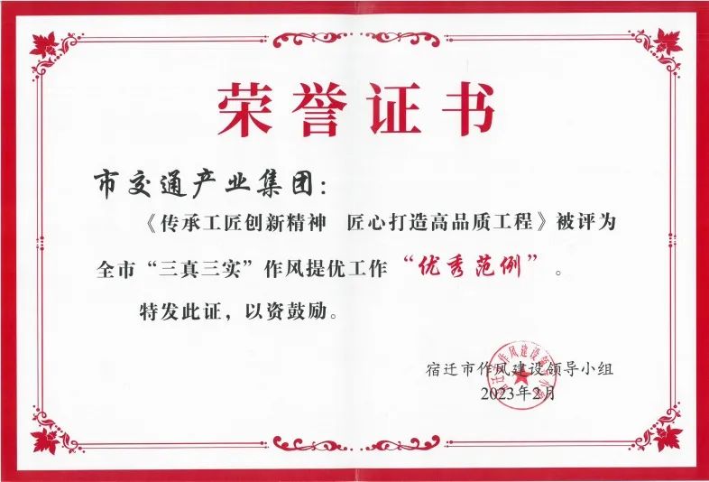 宿遷交通集團(tuán)始終堅(jiān)持一流設(shè)施、一流技術(shù)、一流管理、一流服務(wù),聚焦省級(jí)平安百年品質(zhì)工程目標(biāo),深化現(xiàn)代工程管理,全方位、全過程實(shí)施建設(shè)管理專業(yè)化、工程管理信息化、工程管理精細(xì)化、工程施工標(biāo)準(zhǔn)化、班組管理規(guī)范化,強(qiáng)化制度保障,筑牢質(zhì)量底線,守住安全紅線,大力提升公路項(xiàng)目建設(shè)管理水平,促進(jìn)公路建設(shè)協(xié)調(diào)發(fā)展和轉(zhuǎn)型升級(jí),推動(dòng)宿遷城市化改造項(xiàng)目耐久性和安全性整體提升。