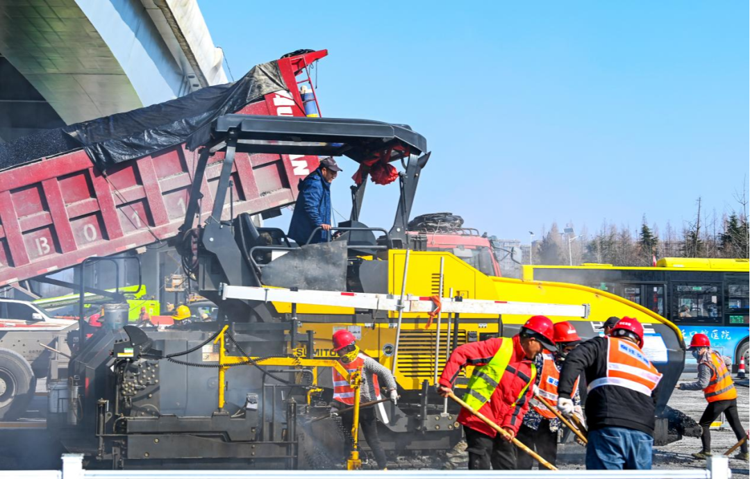 3月7日,開(kāi)始主線橋面瀝青攤鋪施工;