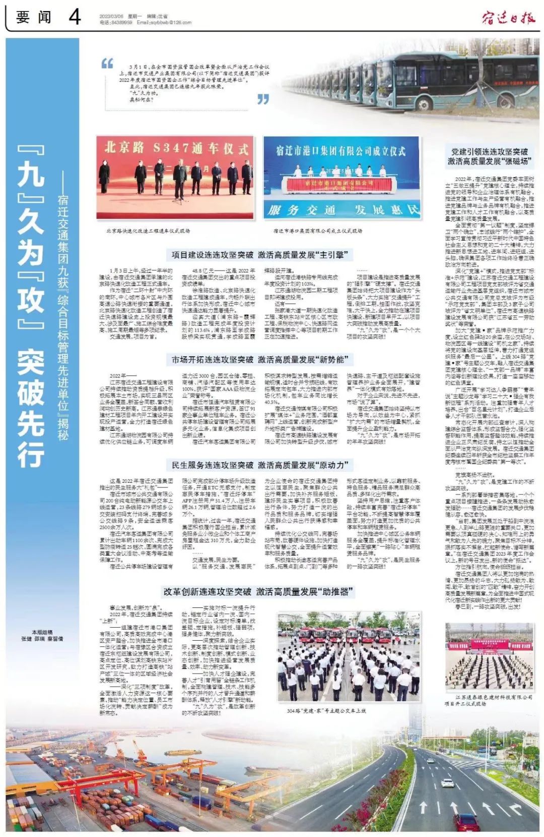 加大“黨建·家”品牌示范推廣力度,設(shè)立紅色驛站20余座,在公交場(chǎng)站、物流園區(qū)等一線建設(shè)“司機(jī)之家”,持續(xù)將黨的建設(shè)向基層延伸,著力打通黨組織服務(wù)“最后一公里”。上線304路“黨建·家”號(hào)主題公交車,融入宿遷交通集團(tuán)黨建核心理念、“一支部一品牌”豐富內(nèi)涵等創(chuàng)新理論成果,打造一座座移動(dòng)的紅色課堂。 廣泛開(kāi)展“學(xué)習(xí)達(dá)人爭(zhēng)霸賽”“青年說(shuō)”主題沙龍等“學(xué)習(xí)黨的二十大·強(qiáng)企有我新征程”系列活動(dòng)。注重加強(qiáng)青年人才培養(yǎng),實(shí)施“百名星光計(jì)劃”,打造企業(yè)后備人才干部隊(duì)伍“蓄水池”。 常態(tài)化開(kāi)展內(nèi)部巡查審計(jì),深入構(gòu)建綜合監(jiān)督體系,形成監(jiān)督合力,強(qiáng)化監(jiān)督職能作用,提高監(jiān)督整體效能,持續(xù)推進(jìn)企業(yè)正風(fēng)肅紀(jì)反腐,持之以恒推動(dòng)全面從嚴(yán)治黨向縱深發(fā)展。宿遷交通集團(tuán)紀(jì)委連續(xù)四年獲得全市紀(jì)檢監(jiān)察工作年度考核市屬國(guó)企紀(jì)委類第一等次。 …… 黨旗高揚(yáng)不迷航。 “九”久為“攻”,是黨建工作的不斷攻堅(jiān)突破。 一系列部署舉措密集落地,一個(gè)個(gè)重點(diǎn)項(xiàng)目接續(xù)推進(jìn),一條條發(fā)展動(dòng)脈愈發(fā)強(qiáng)勁……宿遷交通集團(tuán)的發(fā)展步伐穩(wěn)健從容,愈邁愈快。 “當(dāng)前,集團(tuán)發(fā)展正處于船到中流浪更急、人到半山路更陡的重要關(guān)口,更加需要以頂真碰硬的決心、知難而上的勇氣和敢為人先的魄力,聚焦目標(biāo)不分神、狠抓落實(shí)不懈怠,扛起新使命、譜寫(xiě)新篇章。”在宿遷交通集團(tuán)2023年度工作會(huì)議上,新的號(hào)召發(fā)出,新的使命“抵達(dá)”。 目標(biāo)指引航向,使命砥礪擔(dān)當(dāng)。 宿遷交通集團(tuán)將以更加飽滿的熱情、更加昂揚(yáng)的斗志,大力弘揚(yáng)“四敢”精神,奮力開(kāi)創(chuàng)高質(zhì)量發(fā)展新篇章,為全面推進(jìn)中國(guó)式現(xiàn)代化宿遷新實(shí)踐作出新的更大貢獻(xiàn)! 春已到,一路攻堅(jiān)突破,出發(fā)!