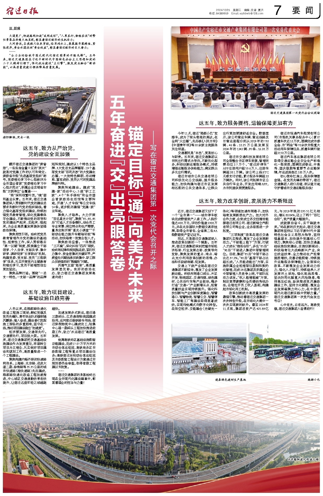 成就源自奮斗,實干鑄就未來。“站在新的歷史起點,宿遷交通集團將堅持以習近平新時代中國特色社會主義思想為指導,堅持強基固本、加快提升黨建核心引領力,聚焦核心功能、加快交通基礎設施投資建設,實施創(chuàng)新驅動、積極培育壯大戰(zhàn)略新興產業(yè),突出效益效率、全力推動生產經營提質增效,完善功能配套、持續(xù)提升運輸服務保障能力,全面深化改革、不斷激發(fā)企業(yè)發(fā)展動力活力,強化人才培引、持續(xù)涵養(yǎng)人才發(fā)展沃土深池,強化底線思維、堅決防范化解重大風險隱患,維持高壓紅線、縱深推進黨風廉政建設工作,堅持文化賦能、激發(fā)企業(yè)發(fā)展凝聚力向心力,在中國式現(xiàn)代化宿遷新實踐中貢獻力量。”宿遷交通集團第一次黨代會發(fā)出號召!