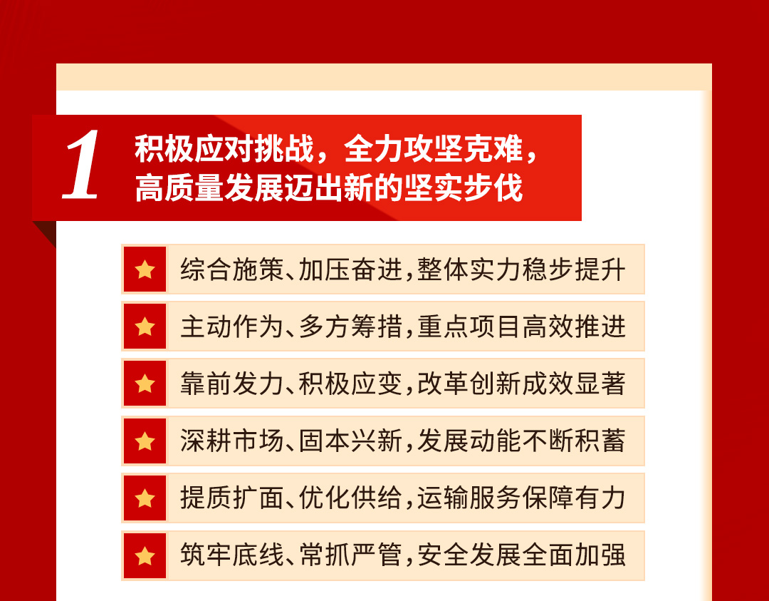 2024年,集團(tuán)堅持以習(xí)近平新時代中國特色社會主義思想為指導(dǎo),全面貫徹落實市委、市政府部署要求,綜合施策、加壓奮進(jìn),整體實力穩(wěn)步提升;主動作為、多方籌措,重點項目高效推進(jìn);靠前發(fā)力、積極應(yīng)變,改革創(chuàng)新成效顯著;深耕市場、固本興新,發(fā)展動能不斷積蓄;提質(zhì)擴(kuò)面、優(yōu)化供給,運輸服務(wù)保障有力;筑牢底線、常抓嚴(yán)管,安全發(fā)展全面加強,扎實推動各項工作取得新進(jìn)展新成效。