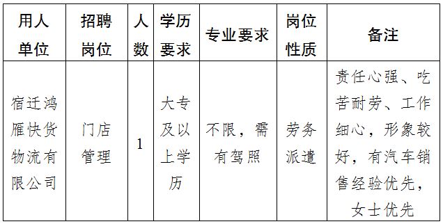 1、用工性質(zhì)為勞務(wù)派遣,勞動(dòng)關(guān)系錄用人員與勞務(wù)派遣公司簽訂勞動(dòng)合同,并勞務(wù)派遣至宿遷鴻雁快貨物流有限公司工作;